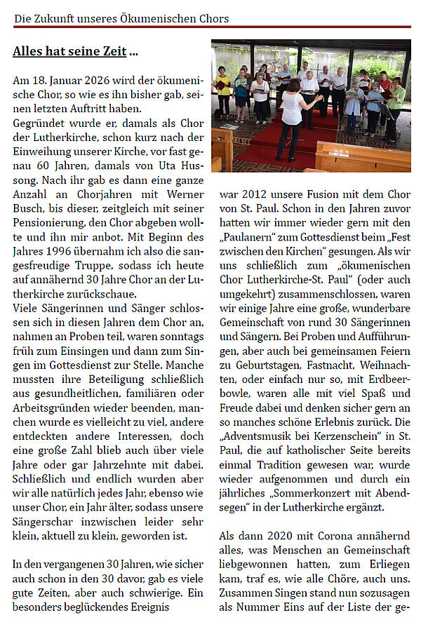 Zum 18.01.2026 hat der ökumenische Chor nun, so wie es ihn bisher gab, seinen letzten Auftritt (siehe dazu unten den Auszug aus dem Gemeindebrief 12-2025).