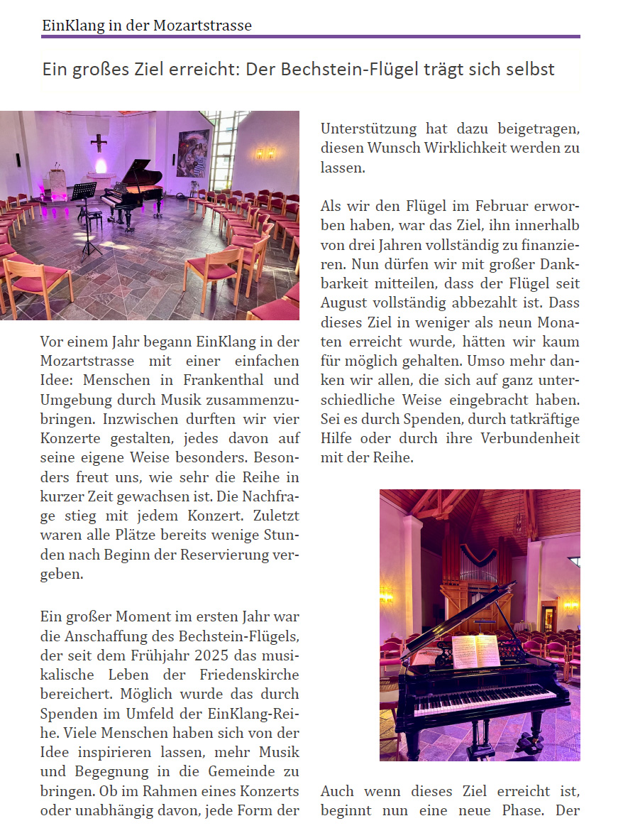 Aktuelle Hintergrundinfos zum Stand der Konzertreihe "Einklang in der Mozartstrasse" (aus dem Gemeindebrief 9-11/2025): --> Teil 1, --> Teil 2.