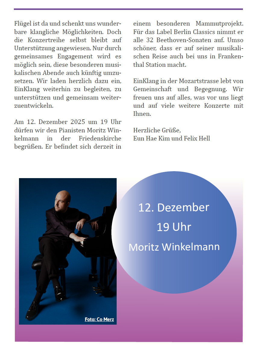 Im Rahmen unserer Konzertreihe "Einklang in der Mozartstrasse" dürfen wir 12. Dezember 2025 um 19 Uhr den Pianisten Moritz Winkelmann in der Friedenskirche begrüßen. Er befindet sich derzeit in einem besonderen Mammutprojekt. Für das Label Berlin Classics nimmt er alle 32 Beethoven-Sonaten auf. Umso schöner, dass er auf seiner musikalischen Reise auch bei uns in Frankenthal Station macht.