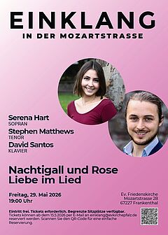 Mit dem Frühling zieht nun ein neues Thema in die Friedenskirche ein: „Nachtigall und Rose – Liebe im Lied“. Am 29. Mai 2026 um 19:00 Uhr erwartet uns ein ganz besonderer Liederabend mit der Sopranistin Serena Hart, dem Tenor Stephen Matthews und dem Pianisten David Santos.