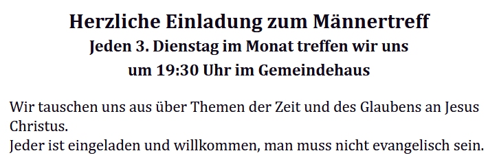 Männertreff, 3. Dienstag im Monat, 19:30 Uhr, "Wir entdecken gemeinsame Wege, den Glauben zu erleben“, Rolf Nagel: 06233 47804 (--> mehr Infos)