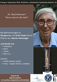 Freitag 06.09.2023 20:00 Uhr in der Lutherkirche. Nachtkonzert mit Betrachtungen von Pfarrer em. Martin Henninger zu Skulpturen des Frankenthaler Bildhauers Erich Sauer und Musik von Telemann, Bach, Jacob, Ibert u. a.. Solisten: Ashby Mayes, Fagott, und Hans-Jürgen Thoma, Cembalo.