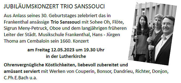 JUBILÄUMSKONZERT TRIO SANSSOUCI am Freitag den 12. Mai 2023 um 19:30 Uhr in der Lutherkirche