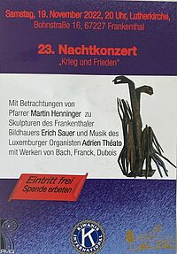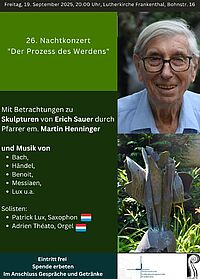 Freitag 15.09.2023 20:00 Uhr in der Lutherkirche. Nachtkonzert mit Betrachtungen von Pfarrer em. Martin Henninger zu Skulpturen des Frankenthaler Bildhauers Erich Sauer und Musik durch Robert Schippers, Jazzpiano, und Hans-Jürgen Thoma, Cembalo.