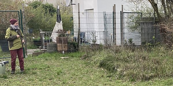 Iris prüft die zugewachsenen Beete. Das linke von den beiden wird am Ende dieses Nachmittages am 13.03.2026 wird Kraut-frei gepflegt sein und bereit für die Staudenpflanzung. Daniel und Axel nehmen sich an diesen Tag zwei Sträucher vor und schneiden das tote oder störende Geäst raus.